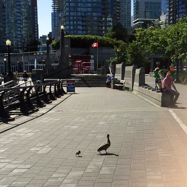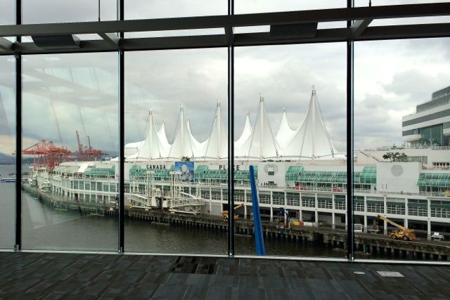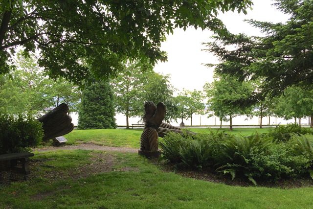The Olympic Torch on the shore of Vancouver Harbor. A fascinating sculptural site during the day.